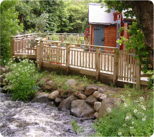 To the rear of the lodge is a large decked area overlooking a fast moving stream and small waterfall.
